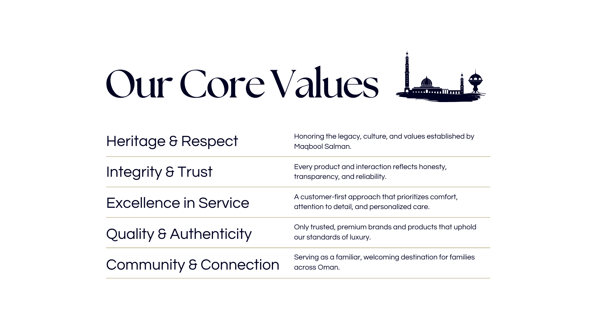 To be the best departmental store in Oman by offering world-class fragrances, beauty, lifestyle, and home collections that bring everyday luxury within reach while honoring our values and service excellence.